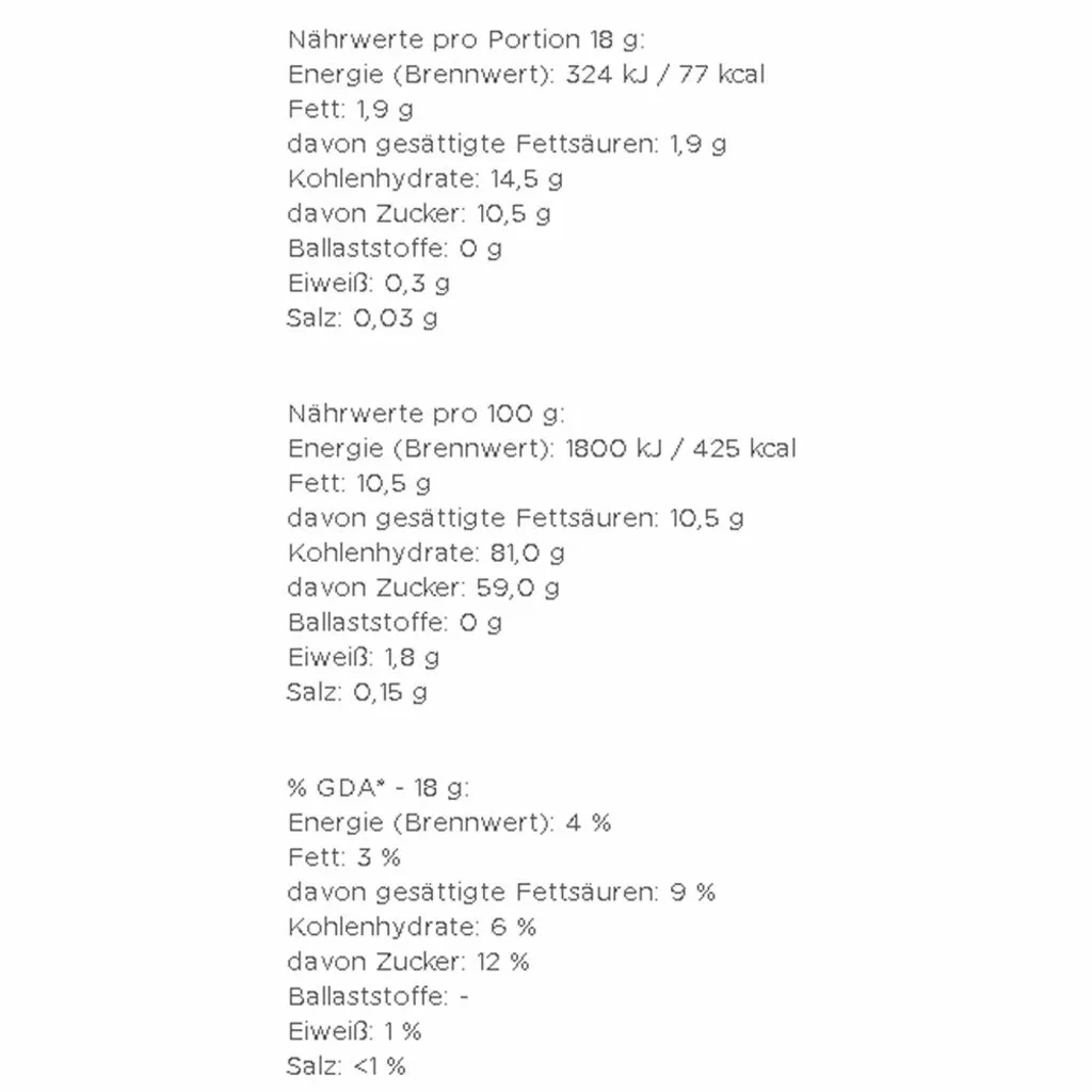 | Zutatenverzeichnis | Zucker (54%), Glukosesirup, Kokosfett (ganz gehärtet), löslicher Bohnenkaffee (8%), Stabilisatoren (E340, E452), MILCHEIWEIß, Emulgator (E471), Trennmittel (E551), Farbstoff (Beta-Carotin) |