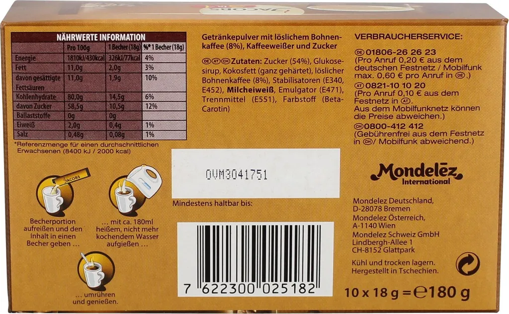 | Lebensmittel-Bezeichnung | Getränkepulver mit löslichem Bohnenkaffee, Kaffeeweißer und Zucker |