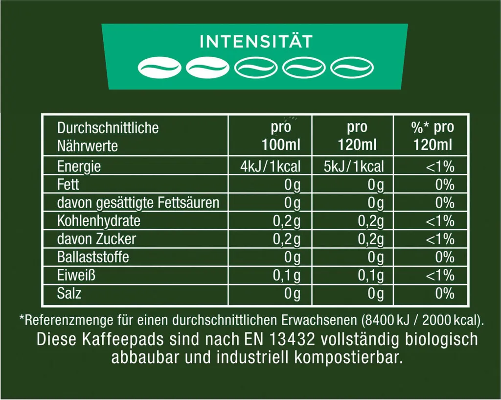 - Mischung aus 50% koffeinhaltigem und 50% entkoffeiniertem Röstkaffee, Kaffeepads