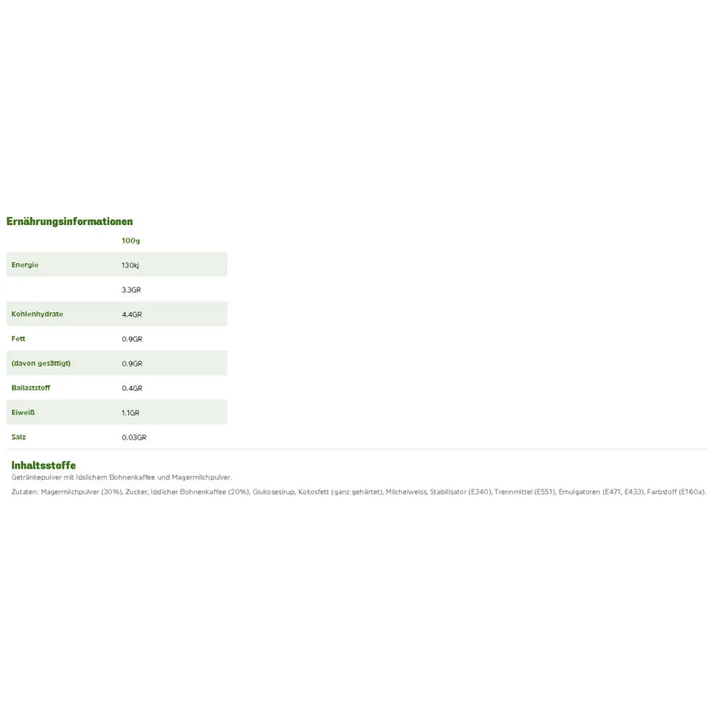 - Zutaten: Magermilchpulver (30%), löslicher Bohnenkaffee (20%), Zucker, Glukosesirup, Kokosfett (ganz gehärtet), Milchproteine, Stabilisator (E340), Trennmittel (E551), Emulgatoren (E471, E433), Farbstoff (E160a)