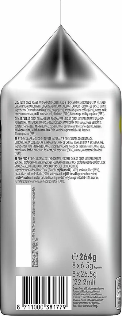 - 8 T DISCs gemahlener Röstkaffee und 8 T DISCs ultrafiltriertes Sahnekonzentrat mit Zucker und Sahnelikörgeschmack für kaffeehaltiges Getränk.