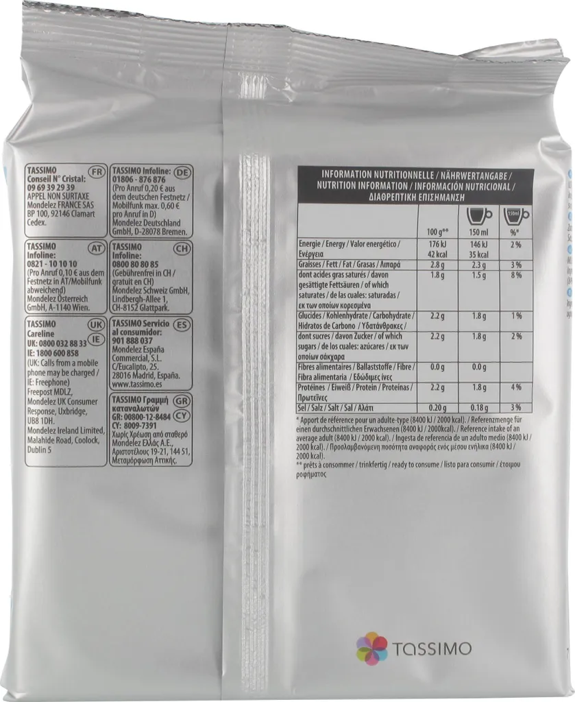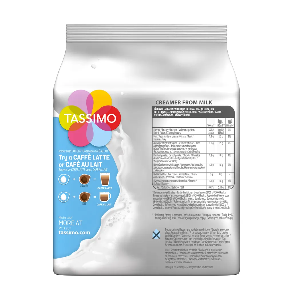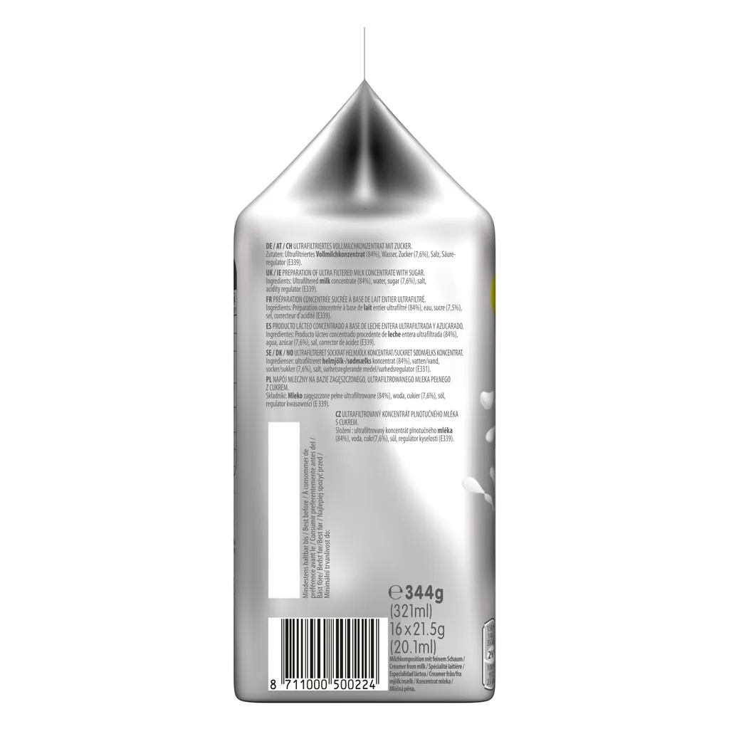 | Name | Tassimo Milchkomposition mit feinem Schaum – Ultrafiltriertes Vollmilchkonzentrat mit Zucker |