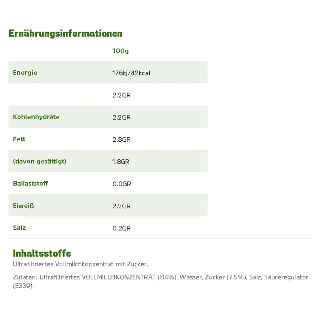 - Zutaten: Ultrafiltriertes VOLLMILCHKONZENTRAT (84%), Wasser, Zucker (7,6%), Salz, Säureregulator (E339).